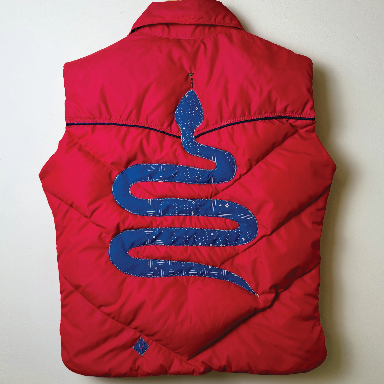 this great Obermeyer vintage vest has a hand embroidered snake on the back, made out of our "hell yeah" heritage bandana, and a tiny horseshoe on the front pocket. i also added a denim heart to the yoke. there is a bit of glue residue above the heart, i got as much of it off as possible, but wanted to let you know.