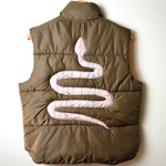 the back of this great vintage vest has a snake design, made from our heritage bandana. i've also hand-embroidered a horseshoe and a patch on the front pocket. it does have a few paint splatters on the shoulder. they are hardly noticeable but wanted to point it out.