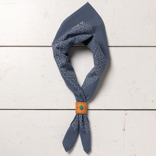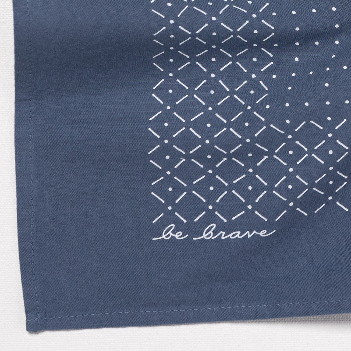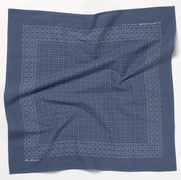 This bandana was handmade in north and south carolina and features a hand-drawn hatch mark design and a printed mantra on one corner, providing a tangible talisman of personal courage.