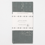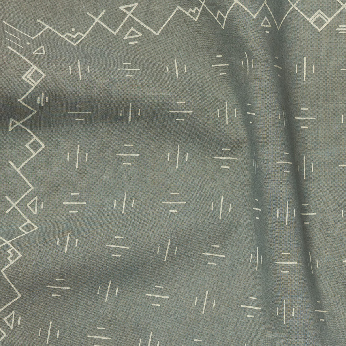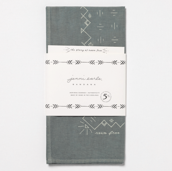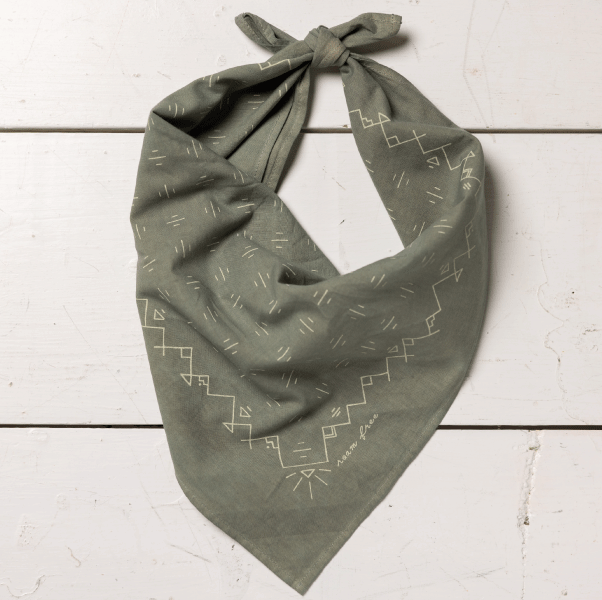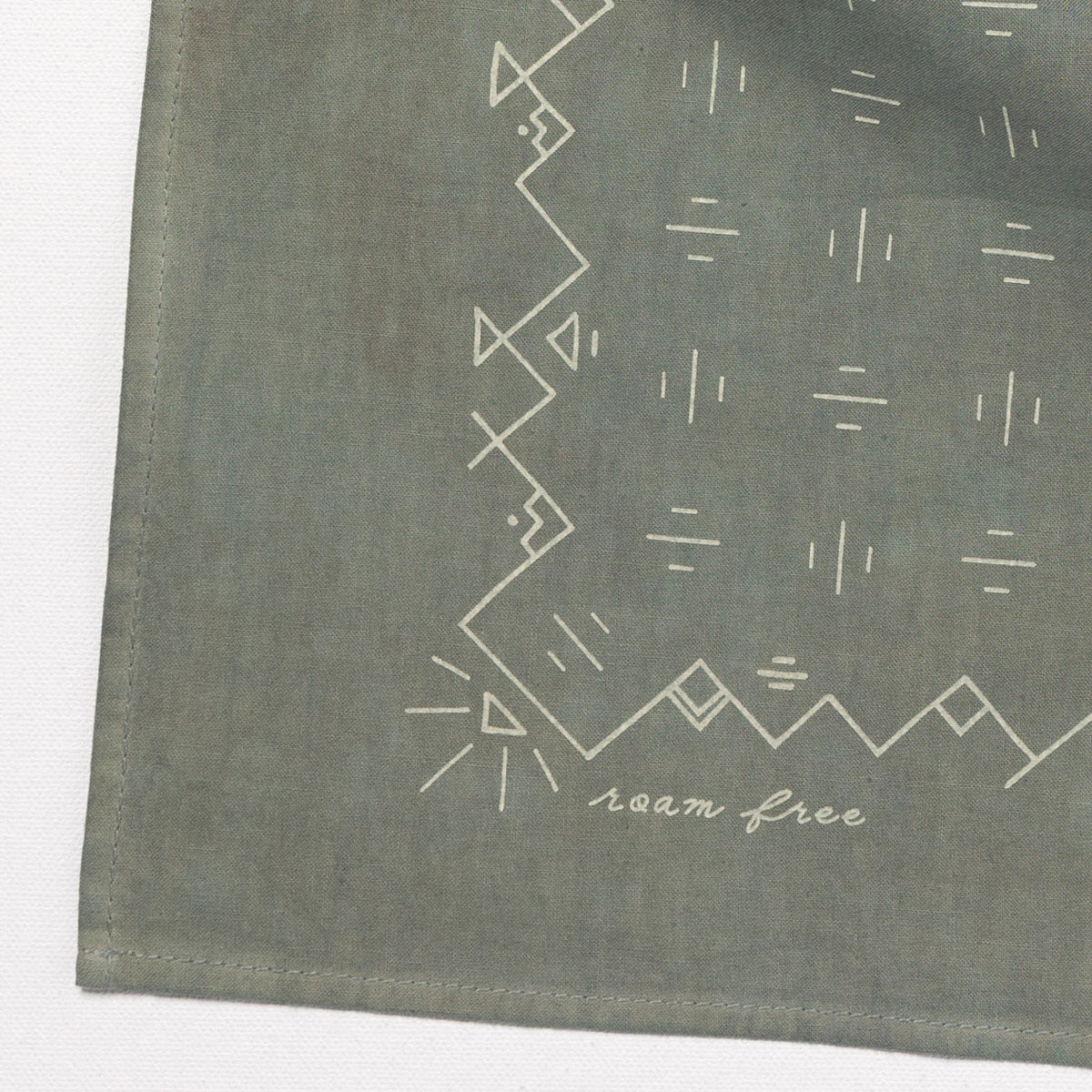 this is our "roam free" hand dyed bandana worn tied around the wrist with some bangle bracelets, with the mantra "roam free" in the corner. the base color is lichen with light tan ink. there is a mountain and hatch mark pattern throughout the bandana.