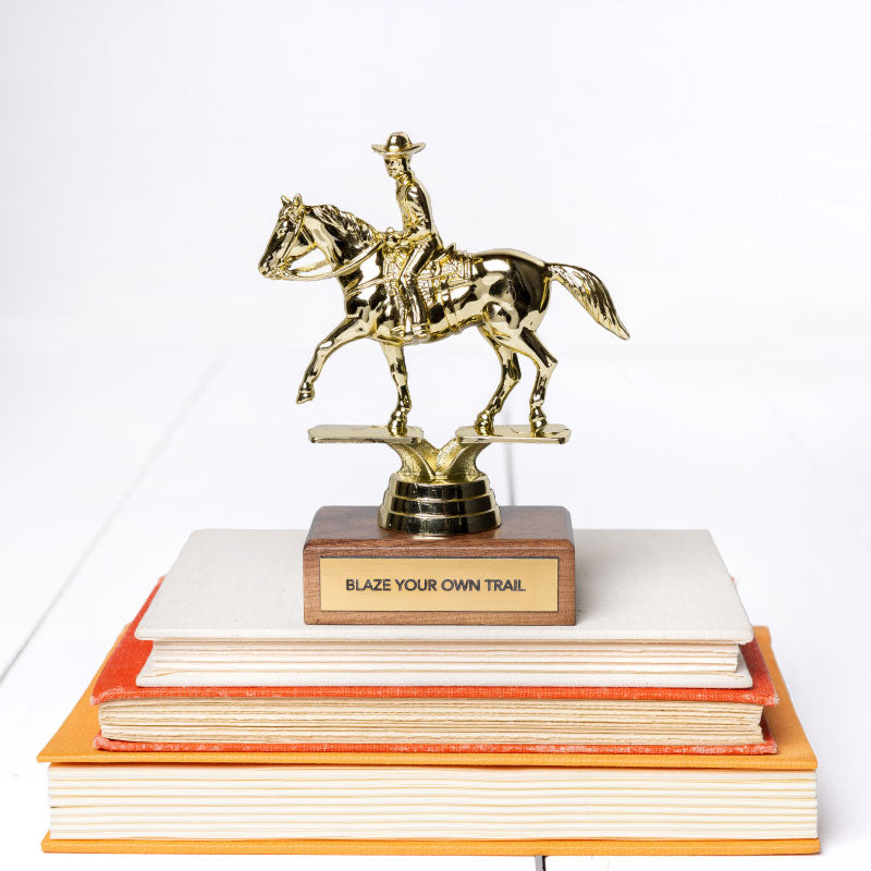 Gold horse and rider trophy with wooden base and 'Blaze Your Own Trail' text on a white background