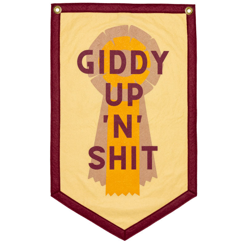 this pennant features a vintage horse ribbon design with the words "Giddy Up 'N' Shit" are screenprinted on felt and finished with a felt border and two brass grommets for hanging.