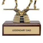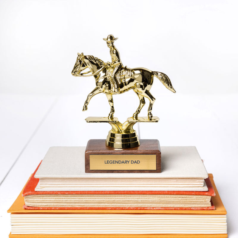 Gold trophy of a person riding a horse with 'Legendary Dad' on a wooden base.