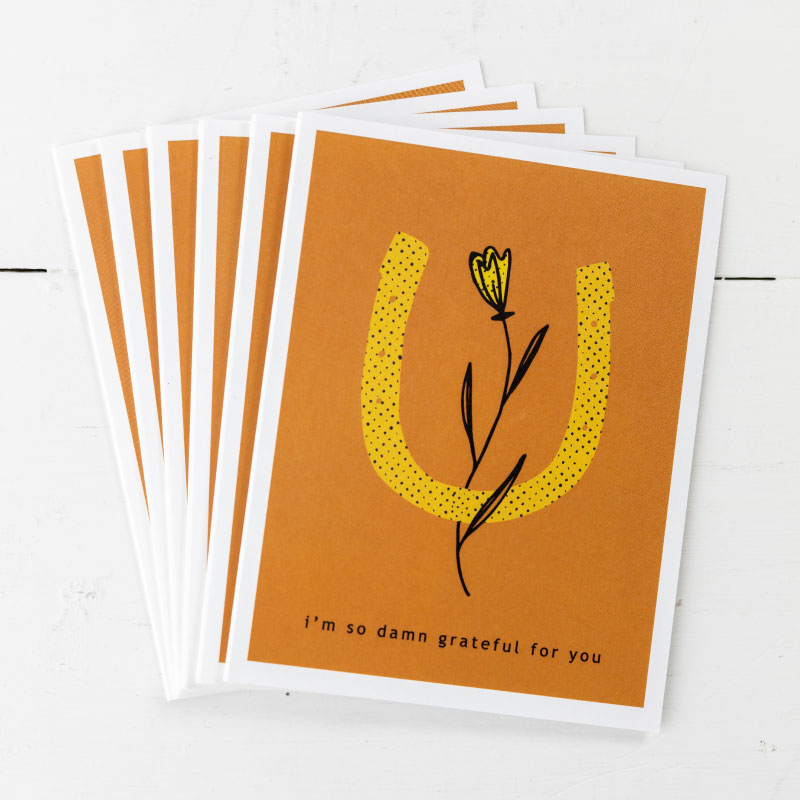 this hand-illustrated greeting card with a fun, stylized illustration with the message "i'm so damn grateful for you" is guaranteed to make them feel your love and gratitude.