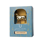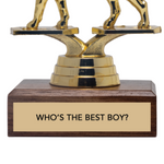 Gold dog trophy with wooden base and 'WHO'S THE BEST BOY?' text on a white background