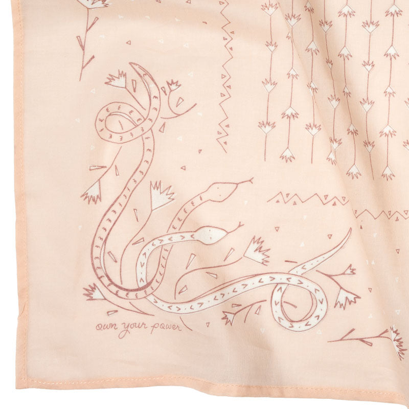 this one says "own your power" at the corner of the bandana. packed with symbols of personal power, the snake and gladiolus flowers, this western style bandana will remind you that there is power within you, all you need to do it own it.