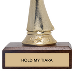 Gold trophy figure with a base reading 'Hold My Tiara' on a white background