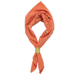 Blue scarf with a brass bandana slide worn by a person, with a focus on the scarf and slide.