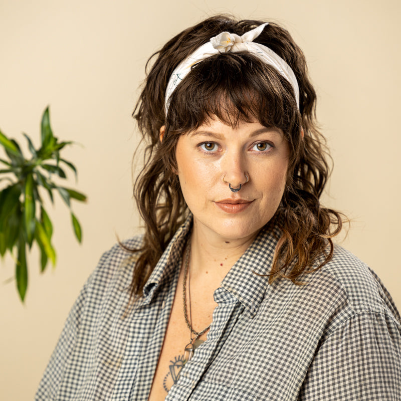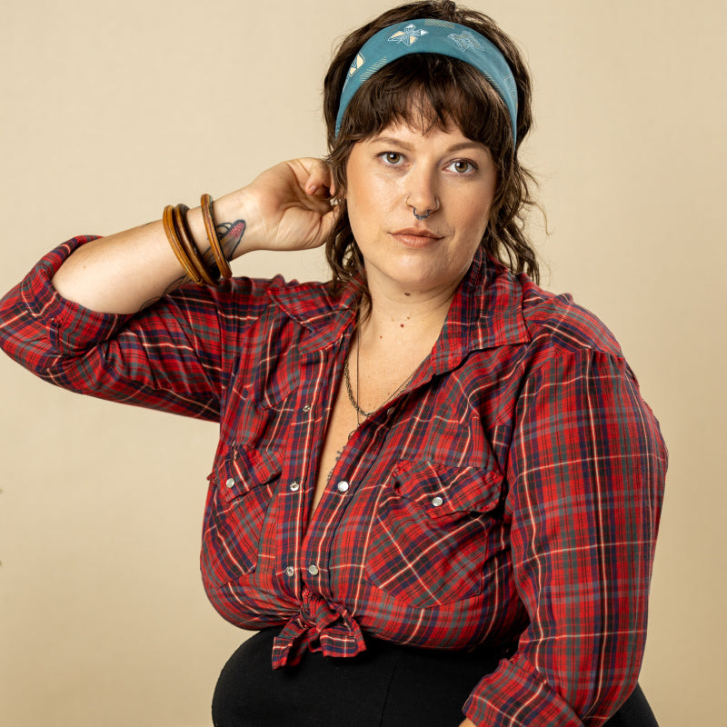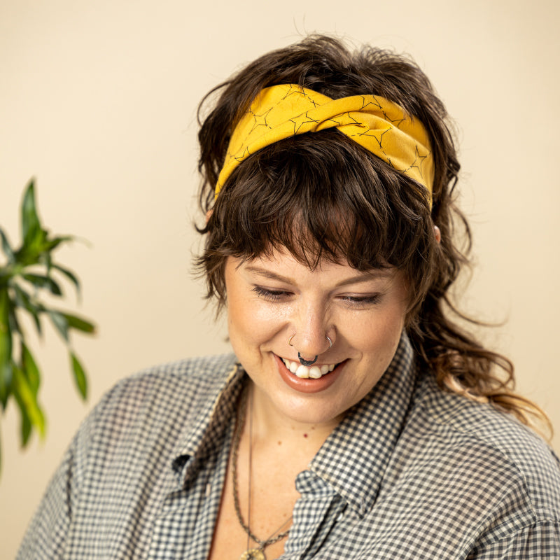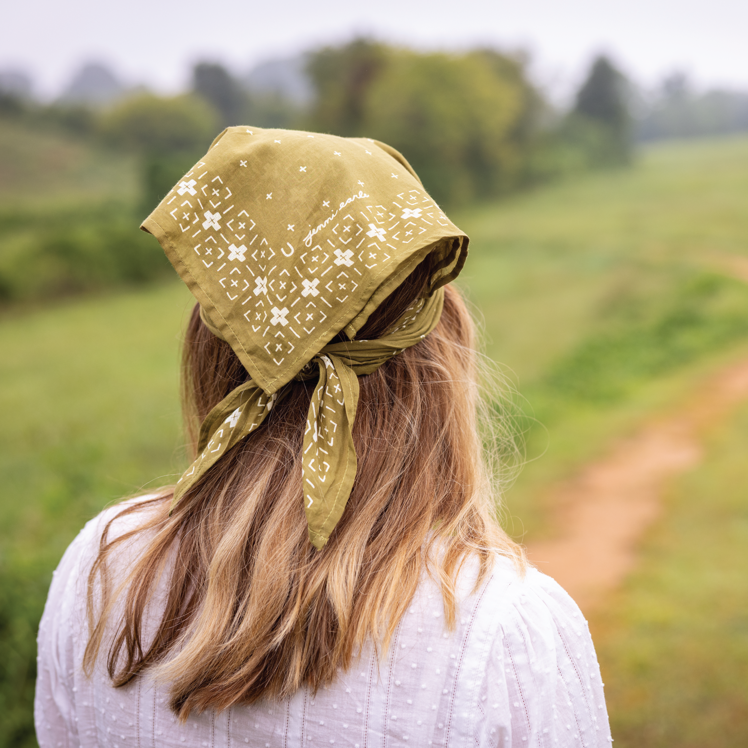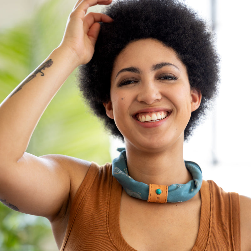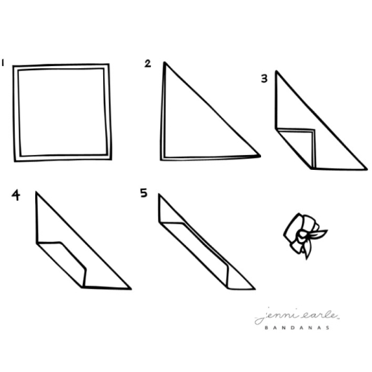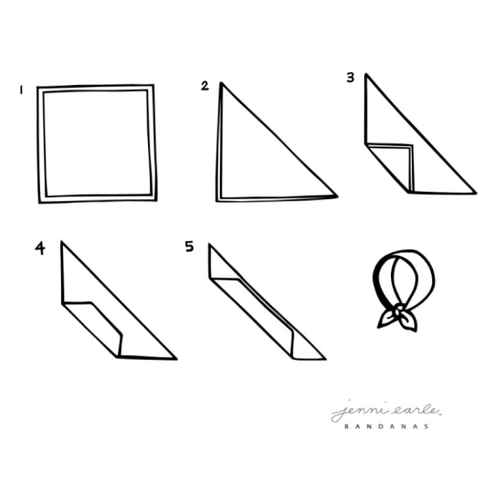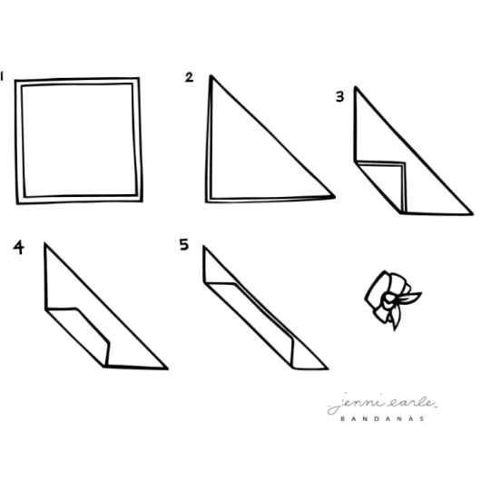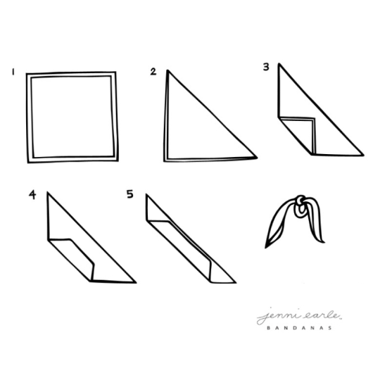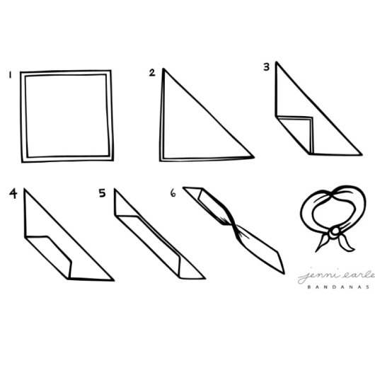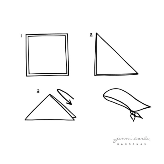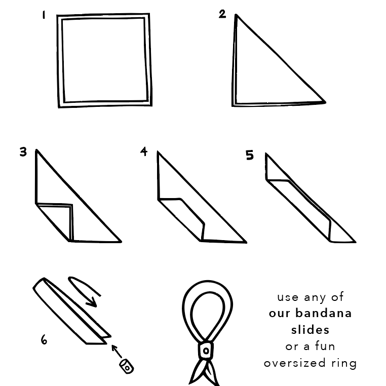 For a pop of color and a mantra that will help you command any room you walk into, try wearing your jenni earle bandana in "the girlboss" style. Start with the bandana flat, pattern side down, then fold in half diagonally into a triangle. Now, fold upwards from the corner three times to create a long band. Finally, thread any of our leather slides on to the band, or even use a fun oversized ring from your own collection. Go get 'em!