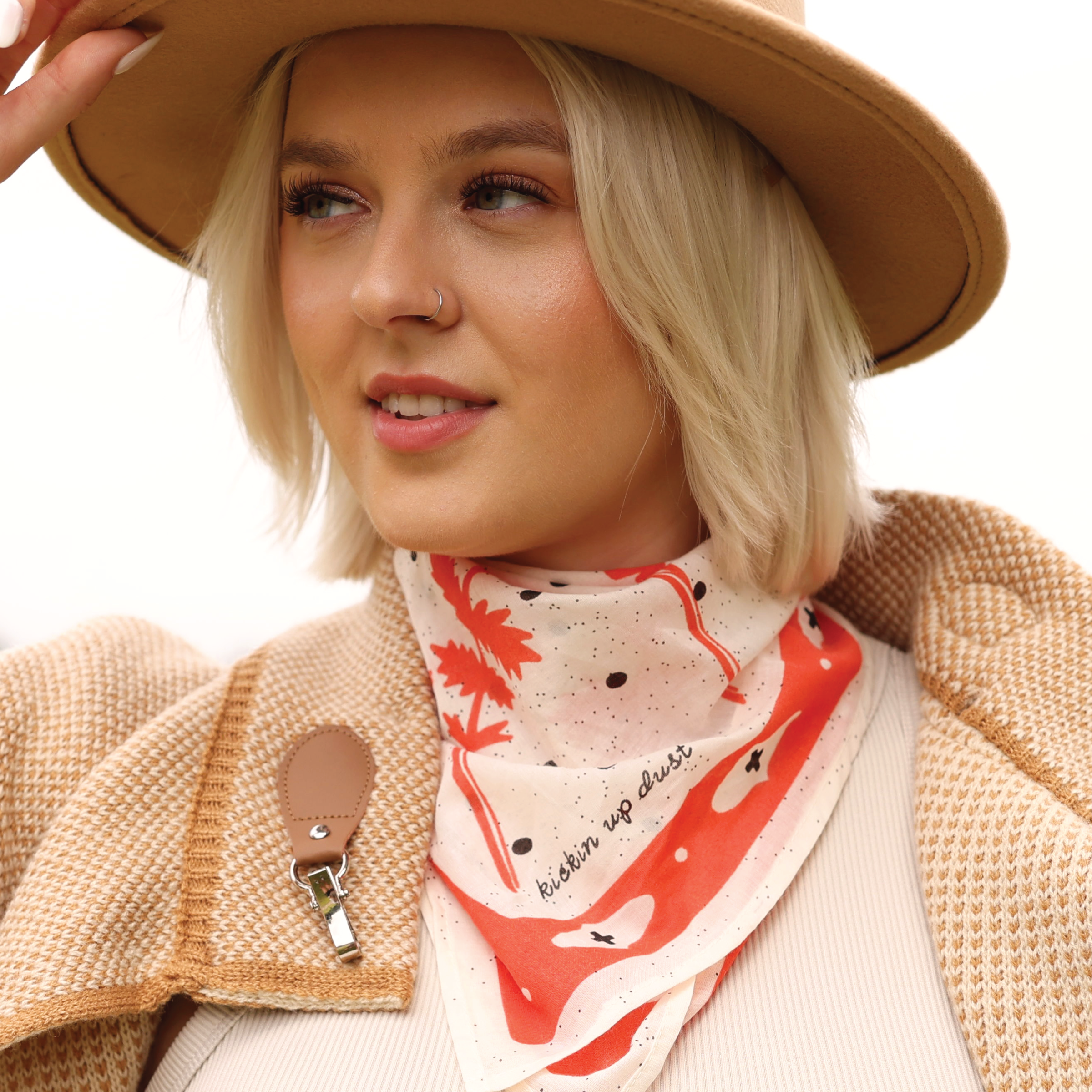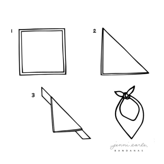 Channel the grit of John Wayne and Julia Sugarbaker combined with this classic, versatile look. Fold your bandana in a triangle, then tie it behind your neck. Whether you’re out on the range or picking one out for a client, this style works on top of everything from a t-shirt to a pantsuit.