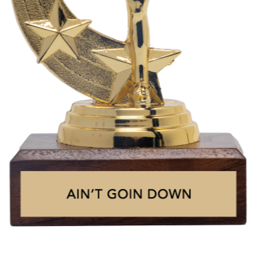 Gold trophy with a figure and 'Ain't Goin Down' plaque on a white background