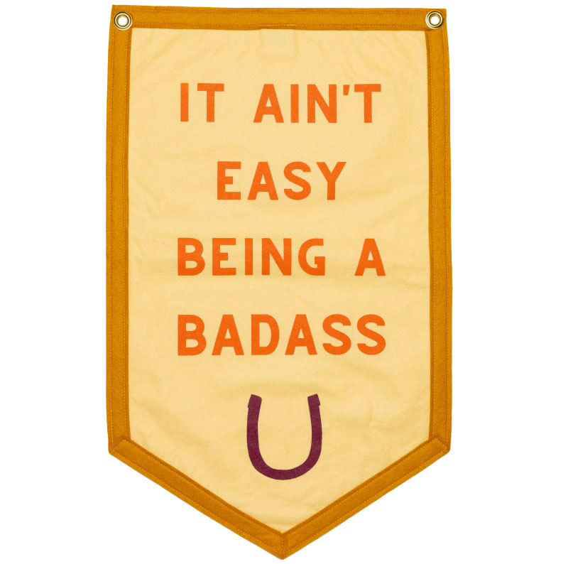 this pennant features a horseshoe design with the words "It Ain't Easy Being A Badass" are screen printed on felt and finished with a felt border and two brass grommets for hanging.